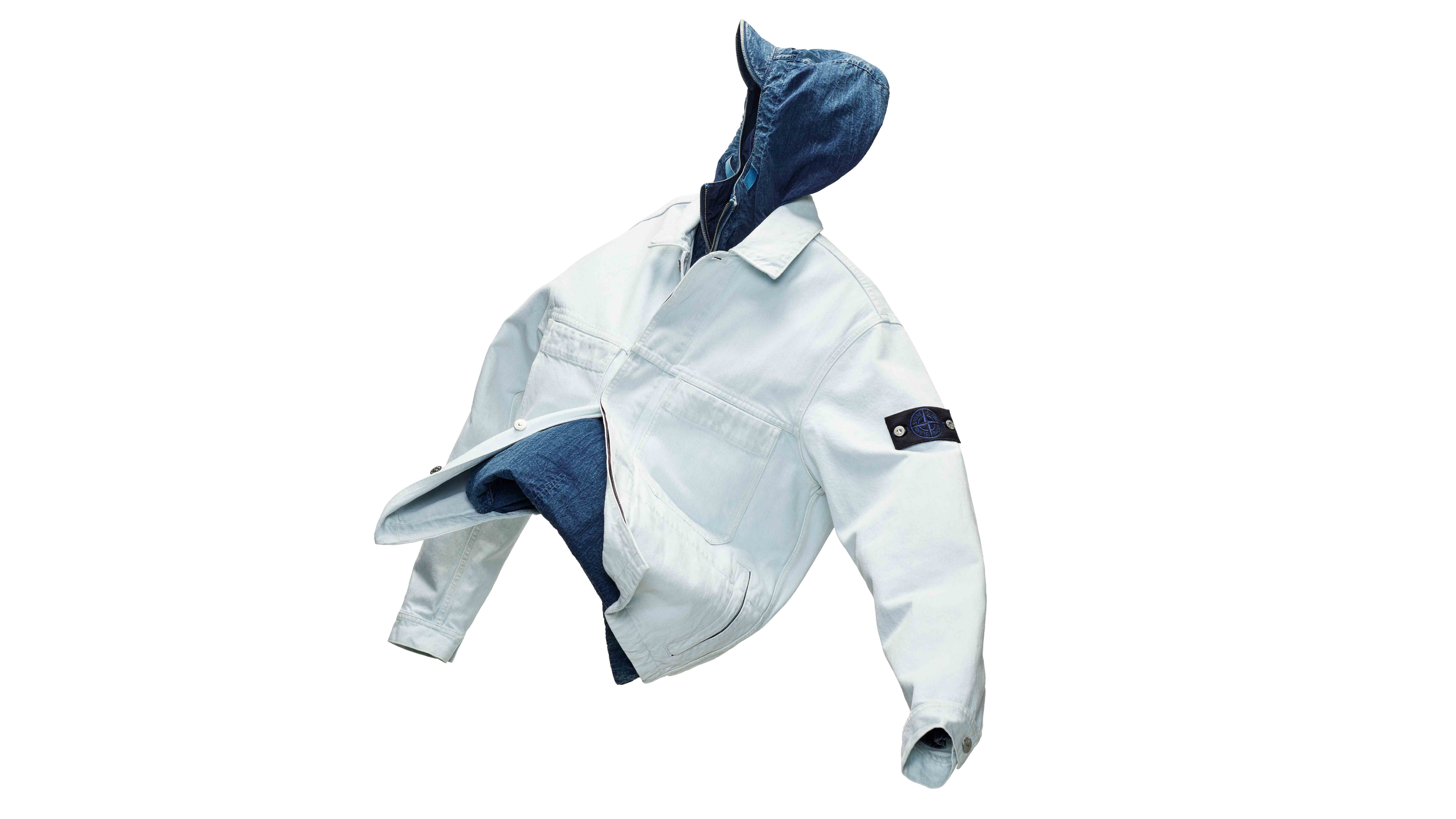 Created as part of Denim Research, explore a series of pieces in an exclusive sage green colourway, available only at the Stone Island website. Actor Charlie Hunnam wears 4100006 coach jacket and J100005 five-pocket jeans in Light Bull Denim-TC.