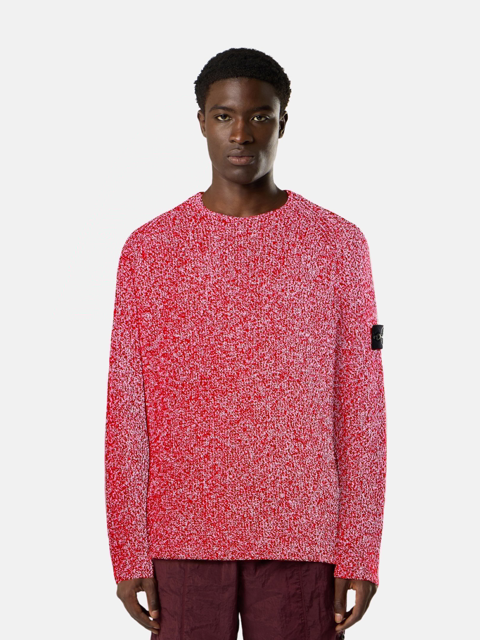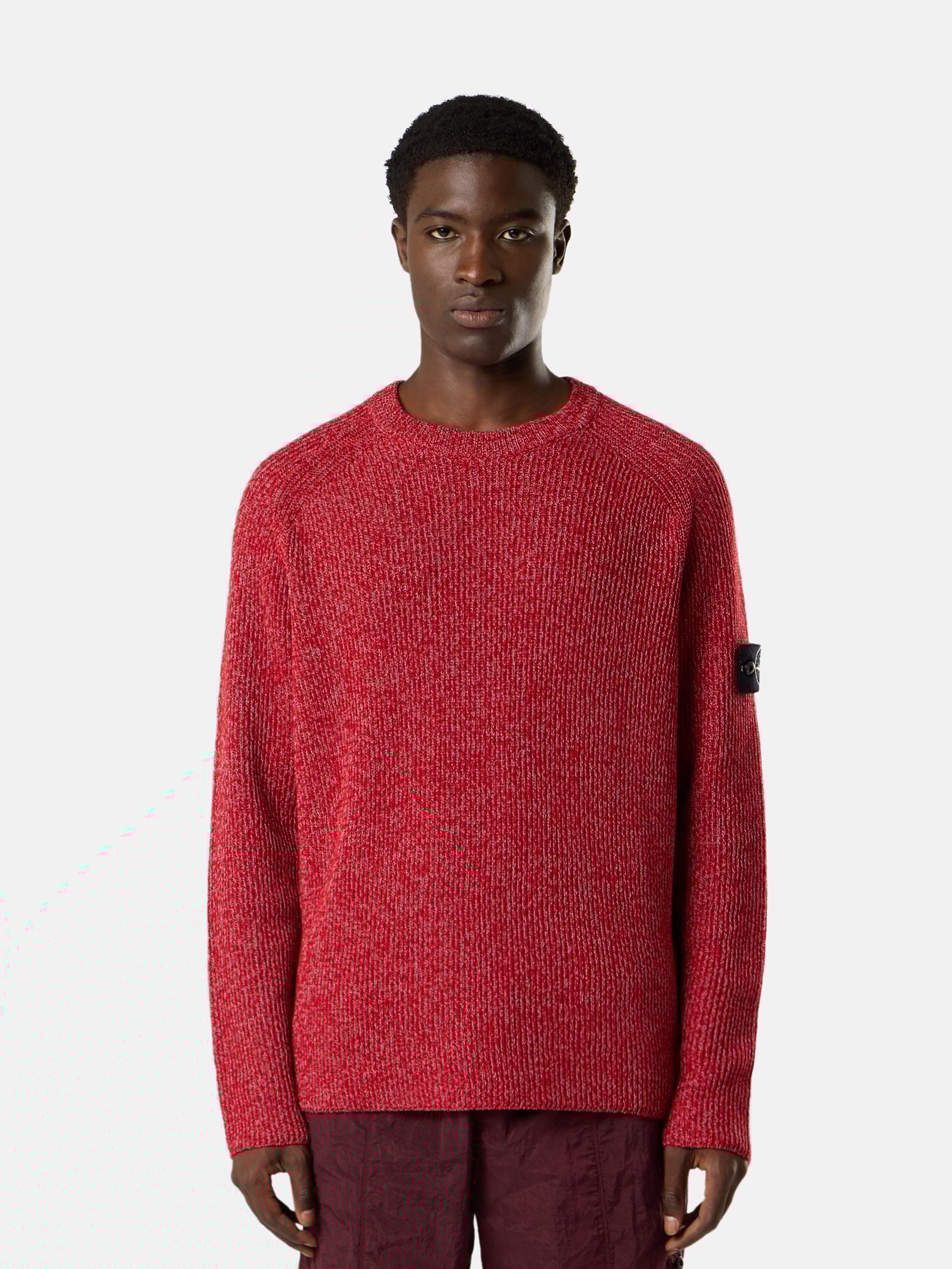 - 5100026 KNIT REFLECTIVE- Knit crewneck jumper made from a linen-wool yarn and a polyester yarn with a reflective coating created through a resin bath that incorporates thousands of glass microspheres that reflect light.