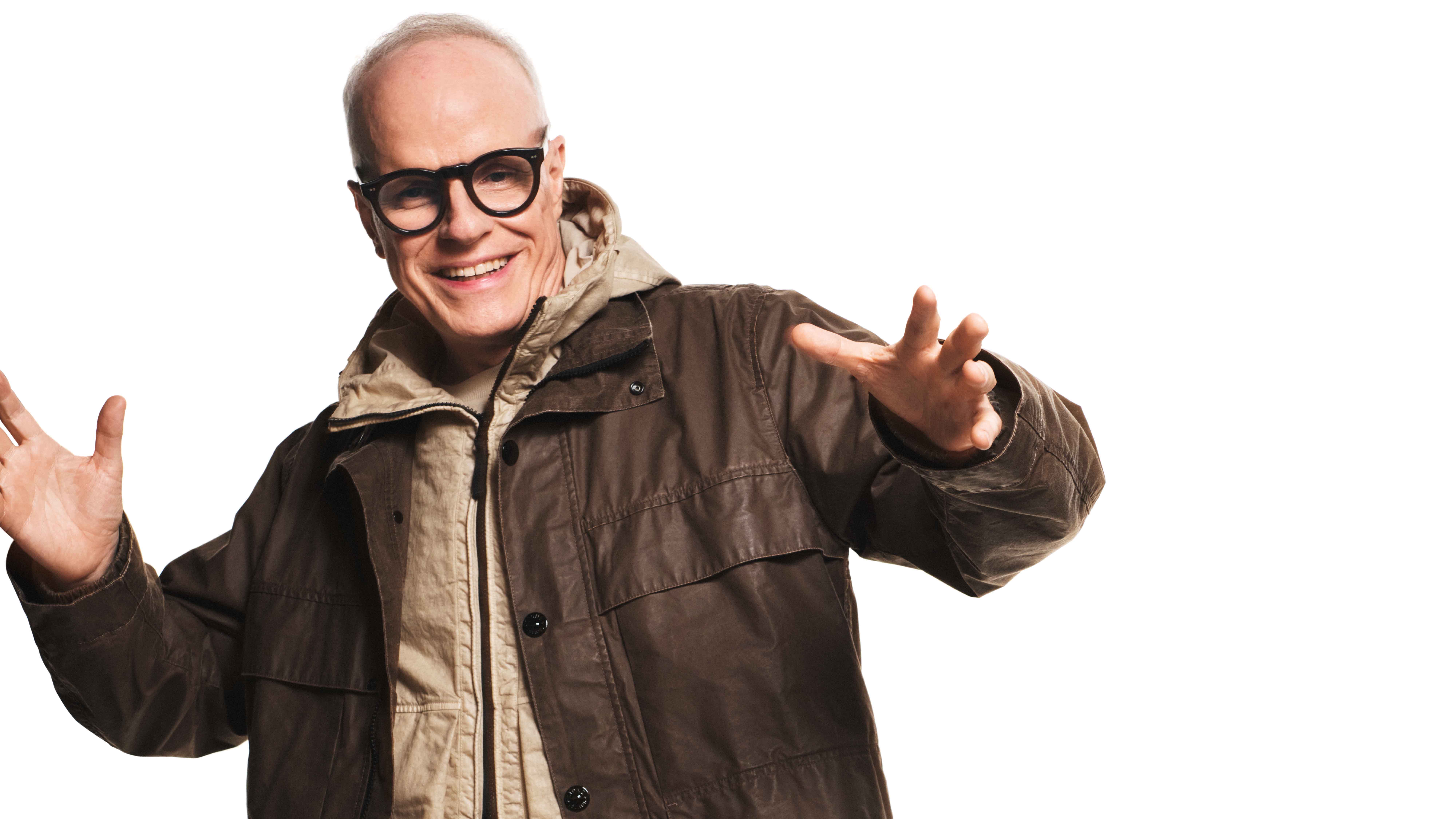 Artistic Director of the Serpentine Gallery Hans Ulrich Obrist wears 4100024 Waxed Pigment Cotton Tela. A cotton canvas tela field jacket is coloured through the application of two different resin coatings: a pigmented wax coating on the outer face, and a glossy rubberised coating on the reverse.
