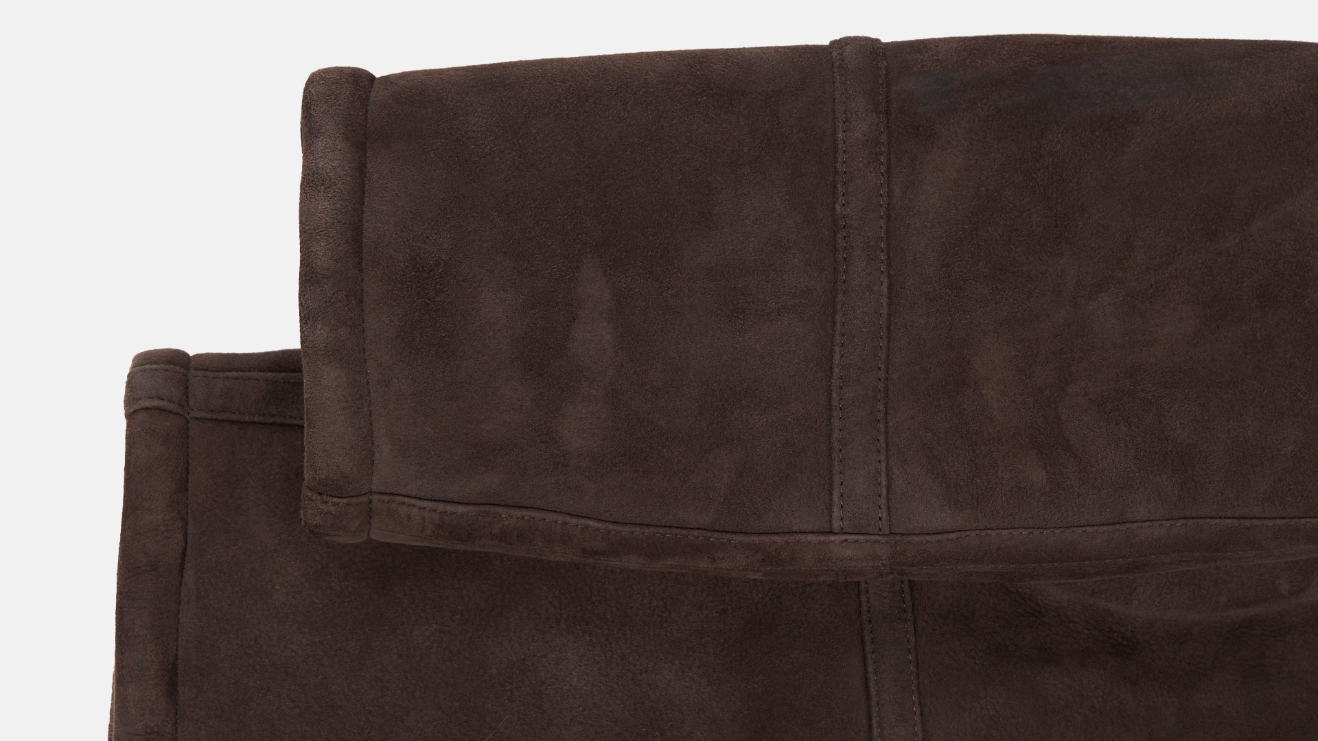 Hooded jacket made of suede sheepskin, treated with an anti-drop agent. The inner hair is treated to achieve a smooth appearance.