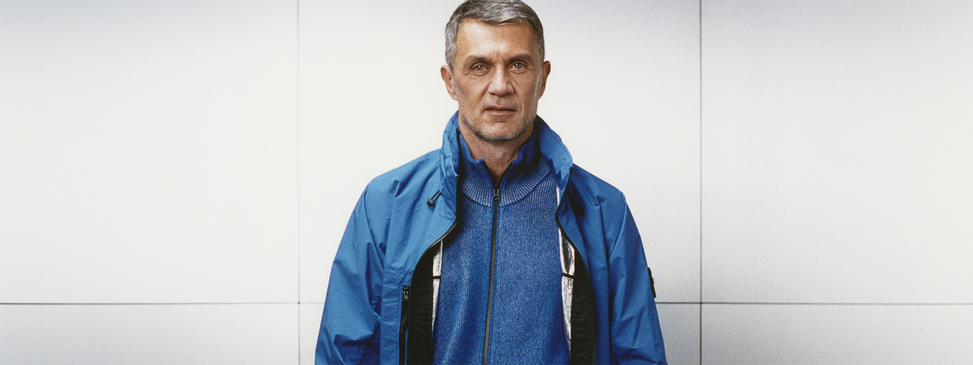 Explore rich variations of blue in the SS '026 collection, extending from deep navy to brighter hues. Outerwear, knitwear, shirts and accessories respond to the dyeing process in unique ways, as the colour interacts with the fabrication. Former football player Paolo Maldini wears 4100059 Metal Lamina Poly Ripstop, a stand collar jacket in a bright blue recycled polyester ripstop.