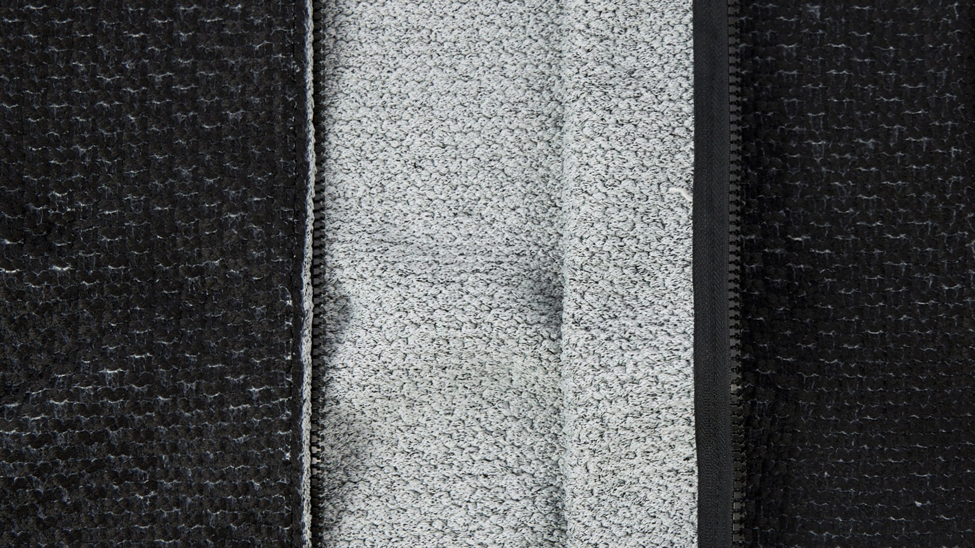 Pull zippé en mélange polyester-nylon extensible avec imprimé sublimatique noir, poches mains et finitions côtelées. Jauge 3.