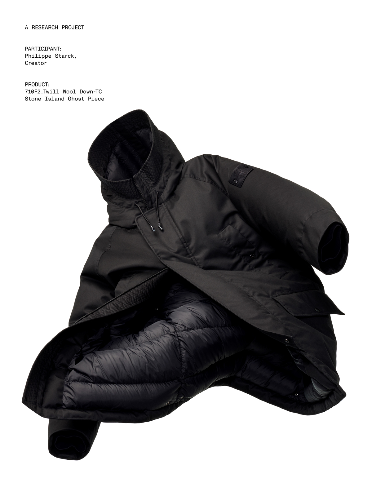 크리에이터 필립 스탁은 가을_겨울 '024-'025 캠페인 비하인드 씬에서 710F2 Performance Twill Wool-TC 소재의 Stone Island Ghost 다운 파카를 착용한 모습으로 포착되었습니다.