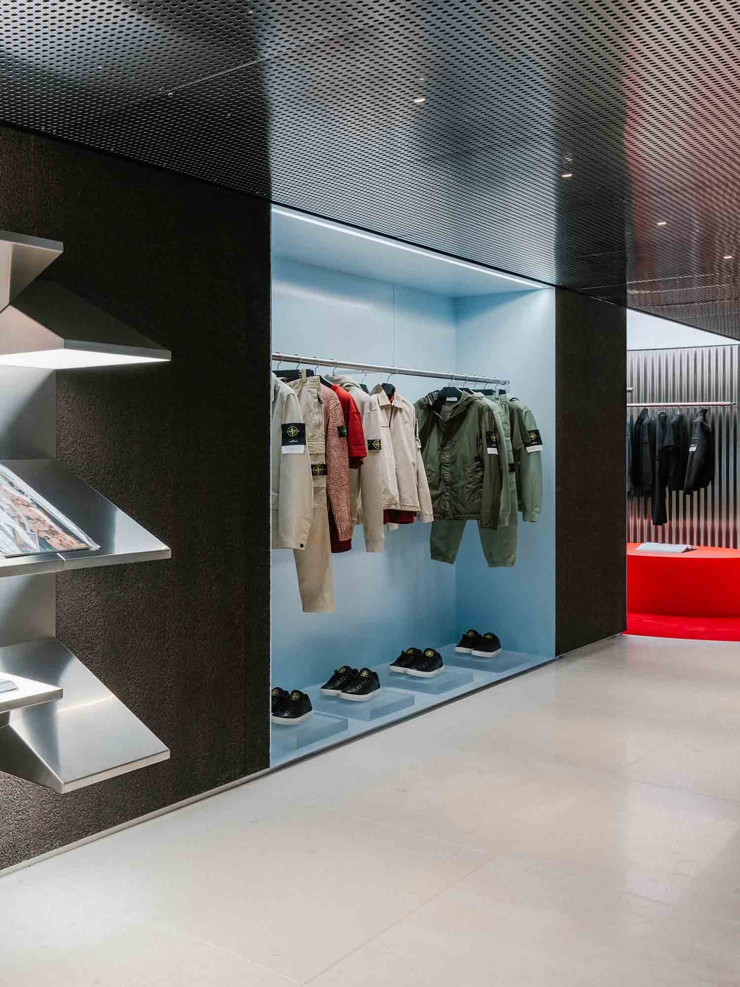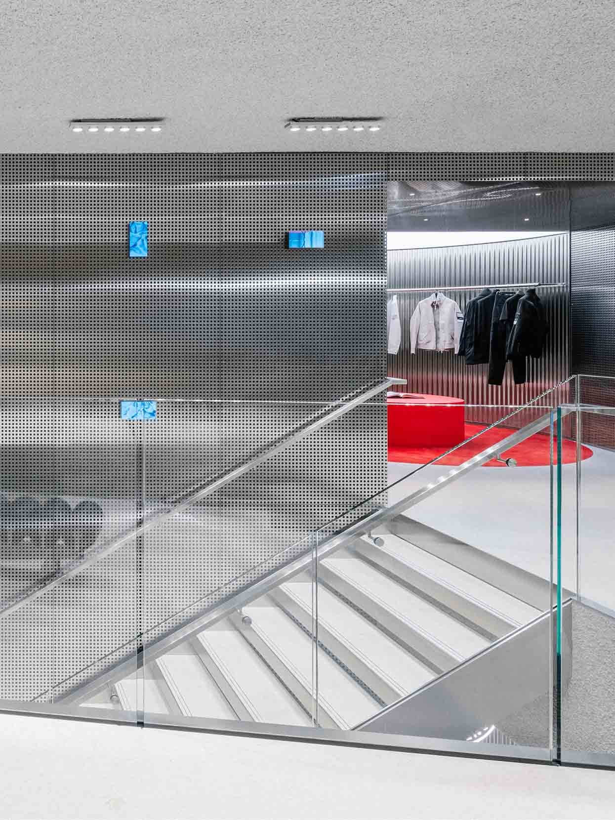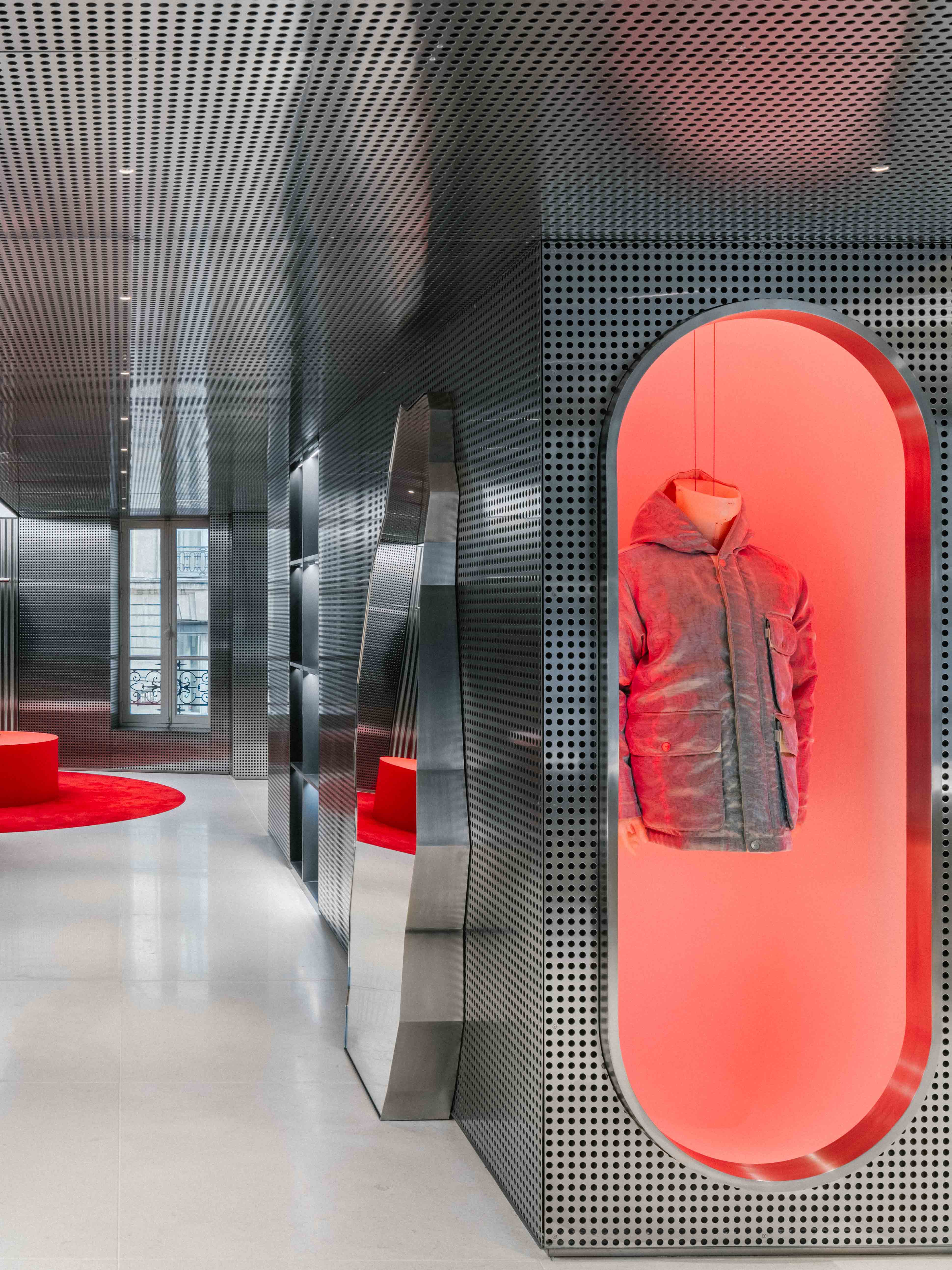 At the store’s entrance, a minimalist anodized aluminium table by Johan Viladrich is featured alongside a large-scale speaker by Mo Yasin, which pays tribute to the city’s multicultural music scene while playing tracks from the Stone Island Sound project. The ground floor includes a glass vitrine by Phil Procter showcasing archival garments and a daybed chair by Markus Toll in a custom palette created for the store. A stainless steel and glass staircase, with mini digital screens along the wall, leads to the upper floor where stainless steel walls frame a pill-shaped red niche. The space is completed by lighting from Davide Groppi and the now iconic aluminium trunk by Elvis Wesley.