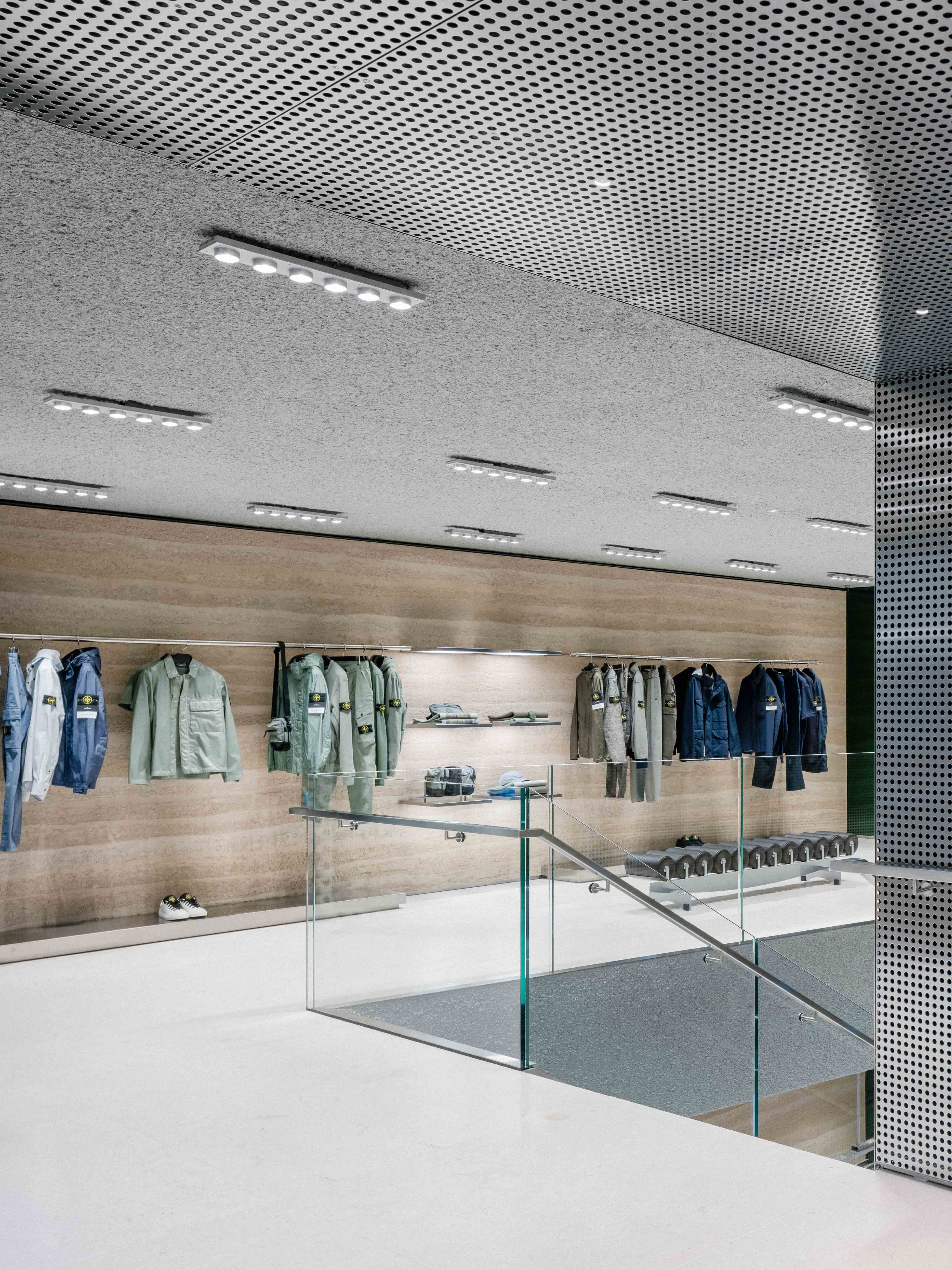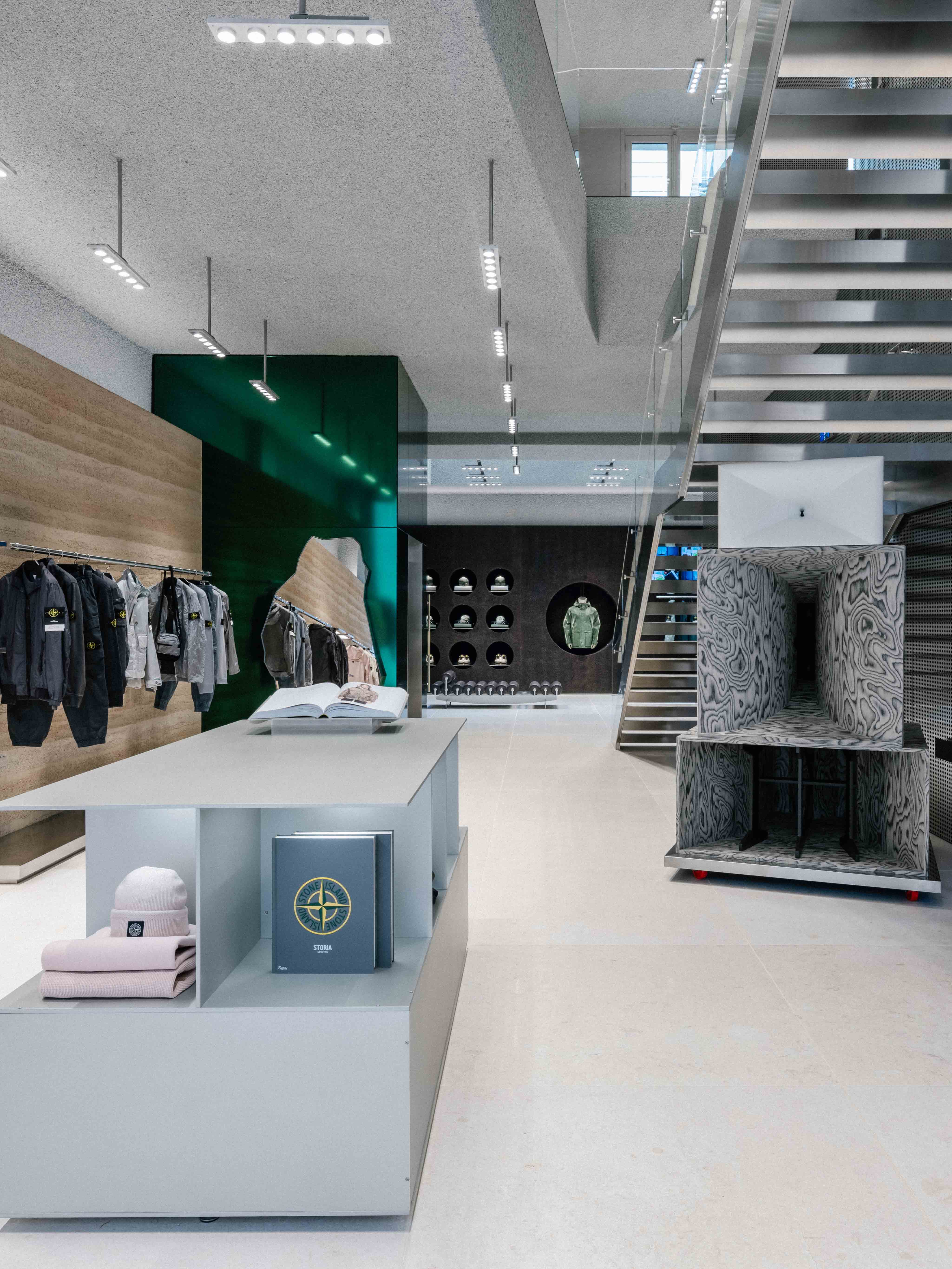 The two-level store is set within a Haussmann-style building in the 1st arrondissement, juxtaposing traditional architecture with Stone Island’s contemporary design ethos. The black metal-framed façade offers a generous view of the interiors where a large skylight fills the space with natural light, highlighting the thoughtful integration of innovative materials with the building's historic character as well as recurring collaborations with creatives.